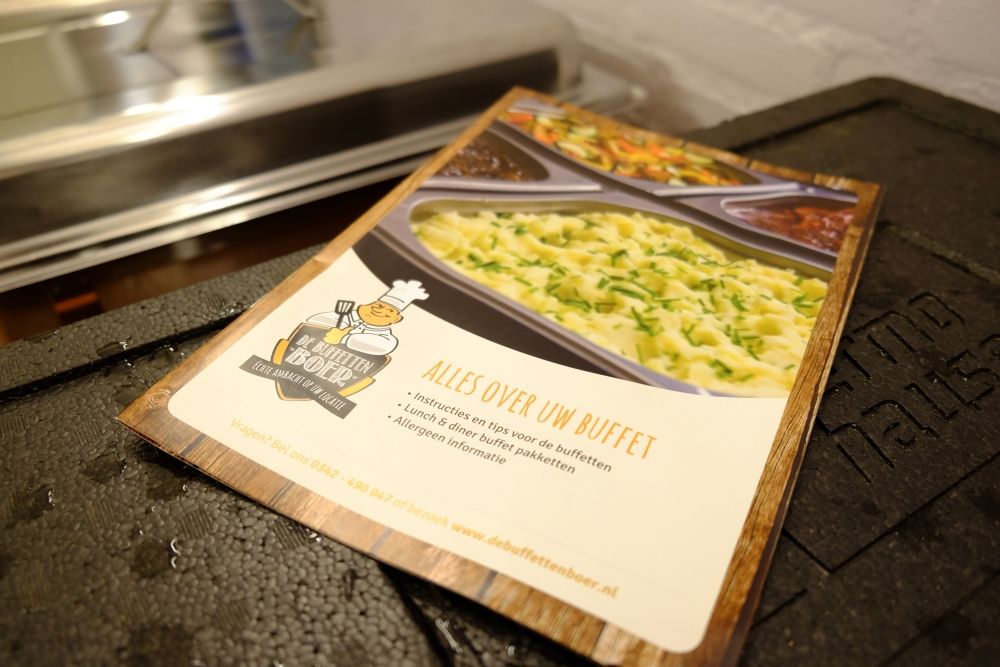 Je geniet van het eten, verzamelt alle borden en het bestek weer in de bak waar je ze ook hebt gekregen. Zet ze er vuil in. En de volgende dag komt de bezorger – weer op het afgesproken moment – het halen. Ze informeren meteen naar hoe je het ervaren hebt, waardoor je weer het hoge service niveau ervaart. Alle reden dus om het meegeleverde boekje ‘Alles over uw buffet’ niet mee terug te geven. Want daar staan alle buffetten nog eens in detail in. Kun je rustig bepalen welk buffet de volgende keer wordt geserveerd. Dat boekje bevat trouwens ook instructies en tips voor de buffetten en allergeen informatie (handig in deze tijd waarin steeds meer mensen allergieën lijken te hebben).