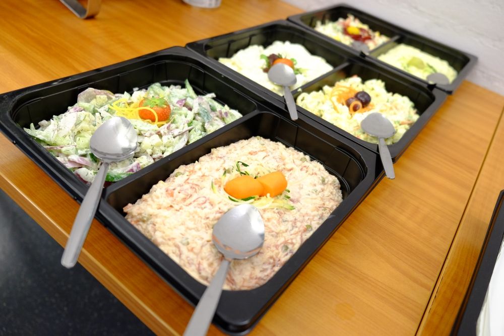 Keuzestress! Kies je dan voor de tongfilet in romige hollandaisesaus, oma’s stoofpotje van rundersukade, scampispiesjes met knoflook, botermalse kipdijfilet in zachte piri piri saus, malse varkenshaassaté met satésaus en gebakken uitjes of verse zalm in botersaus met een vleugje citroen? Daarbij een heerlijke rijstschotel rijkelijk gevuld met verse groenten of bourgondische aardappeltjes met ui en spekjes, wat warme bijgerechten betreft. En qua koudbuffet keuze uit pastasalade met appel en broccoli, boeren tomaat salade, Duitse kartoffelsalade, ambachtelijke rundvleessalade, komkommer appelsalade met een dille dressing en scharreleisalade met een lente-uitje en bieslook. En niet te vergeten: diverse soorten stokbrood mét romige ambachtelijke kruidenboter. En dat allemaal vers gemaakt met vlees van de slager, vis van de visboer en ingrediënten vers van het land. Echt zo lekker!