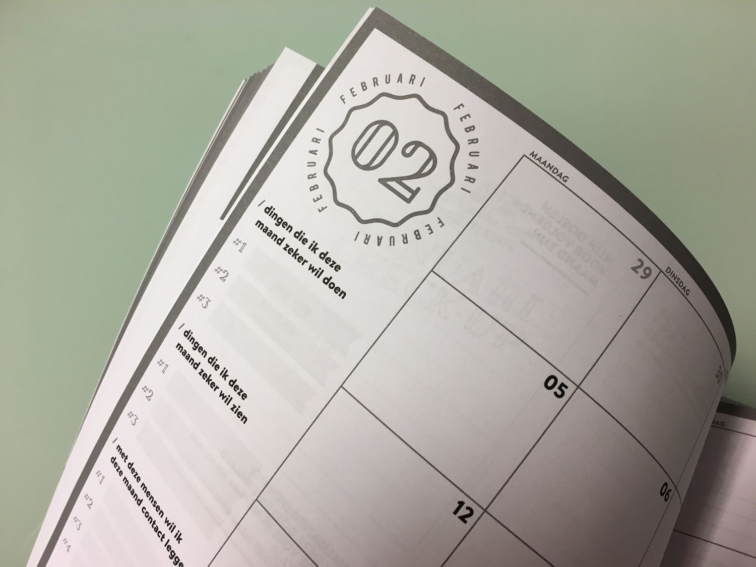 Wat de maandoverzichten betreft, kun je op iedere dag je belangrijke afspraken noteren. Er is daarnaast ruimte voor to do’s, bijvoorbeeld degene van de vorige maand die zijn blijven liggen. Er zijn drie lijstjes die je kunt invullen: dingen die je deze maand zeker wil doen, dingen die je deze maand zeker wil zien en drie mensen met wie je contact wil leggen. Die laatste vind ik echt heel goed. Anderen kunnen je namelijk verder helpen in het verwezenlijken van je doelen. Je moet alleen hulp durven te vragen. Contact is daarbij de eerste stap. En ook de tip mogen we niet vergeten.