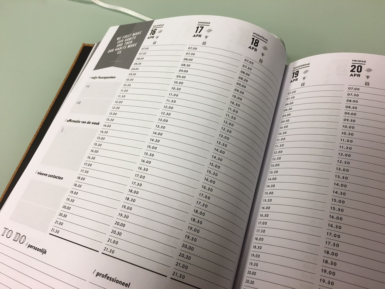 Qua opmaak is de stijl van de SuccesPlanner heel clean en strak. De cover is daarbij heel verfijnd, omdat de letters er in gestanst zijn. Zo staat er niet in koeienletters SUCCESPLANNER op; je kunt ‘m dus gewoon op tafel hebben liggen, zonder dat je steeds opmerkingen krijgt. De één omschrijft de stijl van het binnenwerk misschien als saai, maar ik vind het persoonlijk erg stijlvol. Juist omdat-ie helemaal niet saai is. Tot in detail is namelijk over het ontwerp nagedacht. Kijk maar eens naar de gekozen lettertypes. Hier zit echt de visie van een ontwerper achter. Dat zie je terug. Wel had de ontwerper wat mij betreft iets meer ruimte mogen nemen. Je afspraken moet je echt kort en bondig houden. Je hebt namelijk maar één regeltje per half uur. Dit zorgt er wel voor dat de agenda niet te dik is; wel zo fijn, want hij moet tenslotte overal mee naar toe. Het papier is stevig.