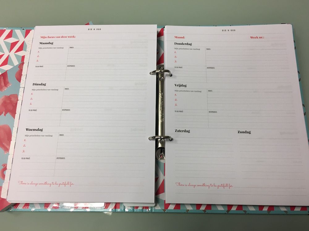 Okay… dat is even wennen. De weekoverzichten zijn echt helemaal anders. De dagen staan nu onder elkaar en de tijden zijn verdwenen. Je hebt nu ruimte om per dag drie prioriteiten aan te geven, met daaronder de privé todo’s. En verder (op rechts) de mogelijkheid om taken (zeven regels) en afspraken (zes regels) te noteren. Zaterdag en zondag zijn helemaal leeg gelaten. Dat voelt wel heel fijn: niets moet. Je bent niet aan tijd gebonden.