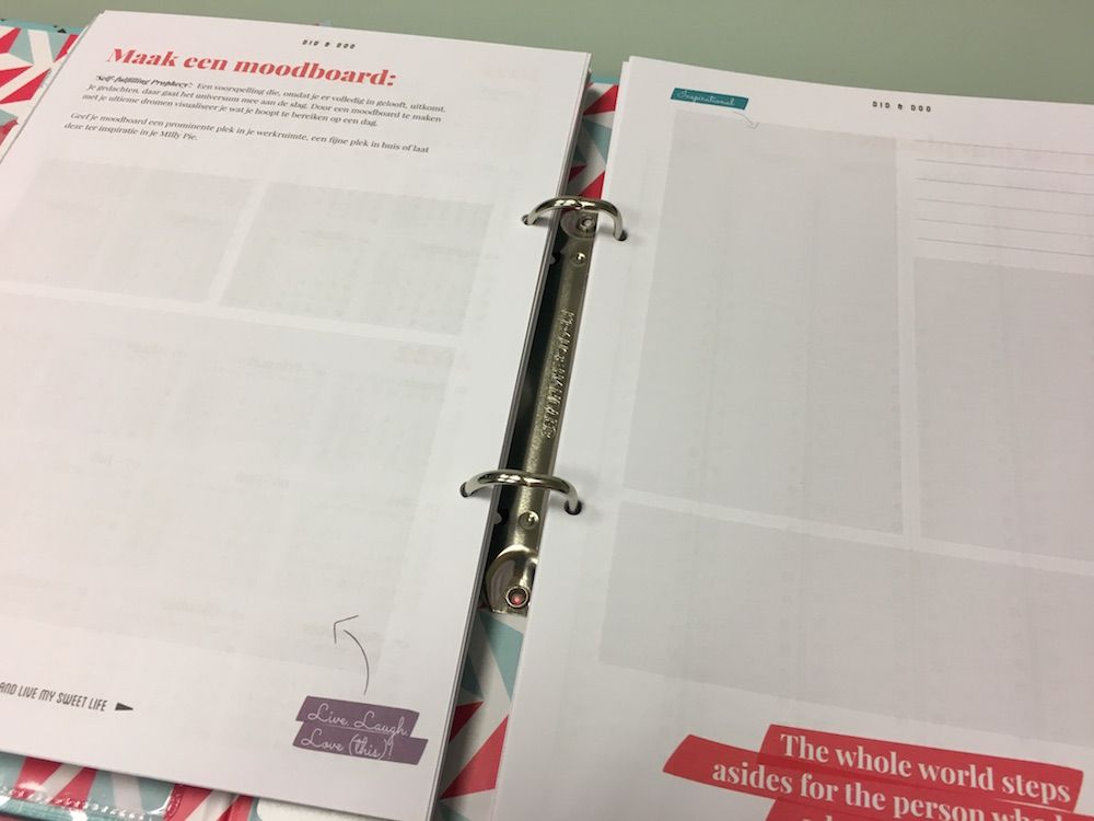 Deze Milly Pie komt samen met een kladblok met meer dan honderd pagina’s. Zo heb je alle plek om je ideeën te noteren. Met een perforator kun je er eenvoudig gaatjes in maken, zodat je de blaadjes in de planner kunt plaatsen. Daar is alle ruimte voor, omdat wordt aangeraden om maar een half jaartje aan vulling in de planner te doen. Dat is het fijne aan een ringband; je bepaald zelf wanneer en hoe je er de inhoud in doet. Die inhoud is ongedateerd, dus je hoeft ook niet per sé begin dit jaar meteen te starten
