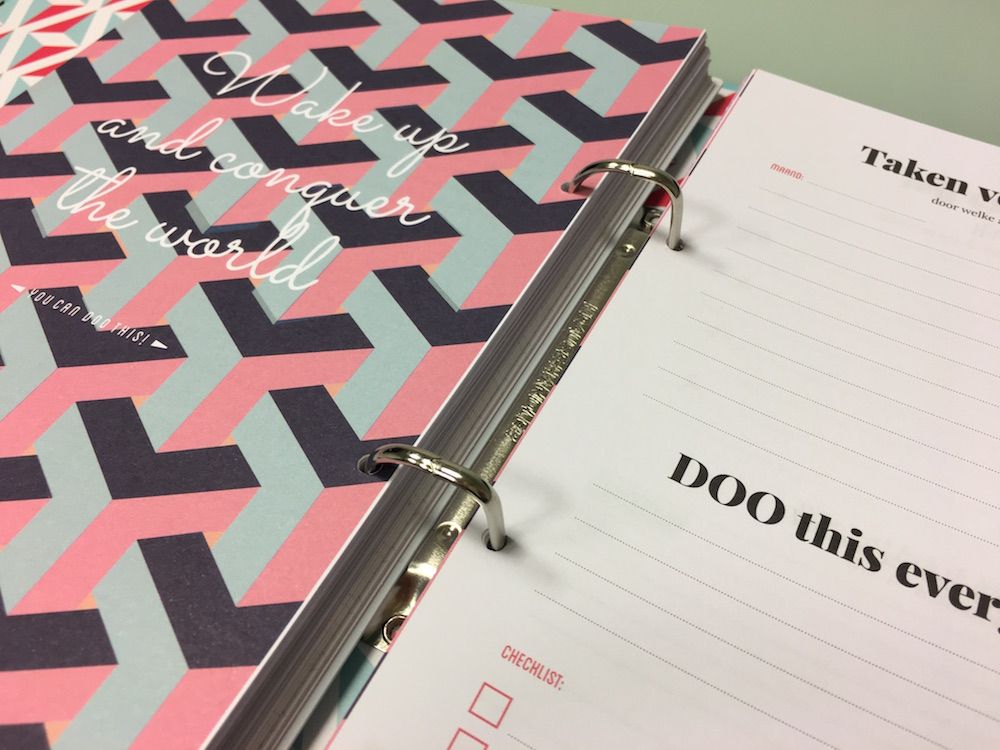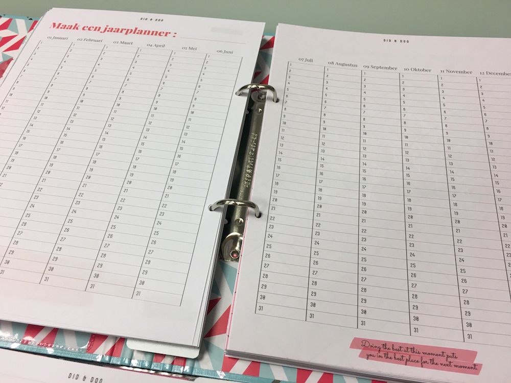 Niet alleen de ringband is veranderd, ook de inhoud heeft een nieuw jasje gekregen. Zo is het hierboven beschreven moodboard nieuw. En je hebt in de horizontale inhoud ook ruimte om een jaarplanning te maken. Iedere dag heb je ruimte voor één woord. Maar je kunt ook iedere dag die volgepland is markeren, zodat je eenvoudig in het overzicht ziet wanneer je nog ruimte hebt voor grotere klussen. En voor de mama’s onder ons: markeer hierin de vakanties. Wil iemand een afspraak met je maken, dan zie je meteen wanneer het vakantie is.