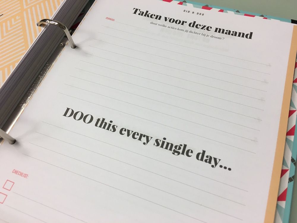 Nieuw zijn de Taken voor deze maand. Door welke acties kom jij dichter bij je droom? Daarnaast staat er iedere keer het DOO this every single day… overzichtjes bij en een checklist met punten. Dat kunnen dingen zijn die je die maand wil doen. Of zaken die eigenlijk niets met je doel te maken hebben, maar die je gewoon wil. My must DOO list voor de maand en week zijn gebleven, net als het overzicht na afloop van de maand en de notities. Aangevuld met de braindump.