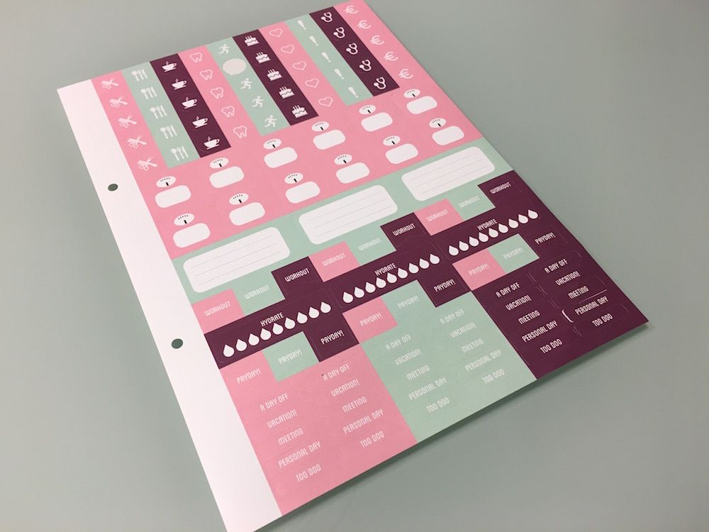 En laten we de stickers niet vergeten. Met afbeeldingen voor de kapper, uit eten, koffiedames, tandarts, hardlopen, taartjes, hartjes, uitroepteken, dokter en euro-teken. Maar ook met de weegschaal, work out, water overzicht, payday en omschrijvingen als a day off, vacation, meeting, personal day en to do. Die laatste passen precies in het vakje van het jaarschema. Die stickers kun je per drie velletjes voor 6,50 euro bij bestelen. Niet getreurd dus als je zo door het eerste velletje heen bent.