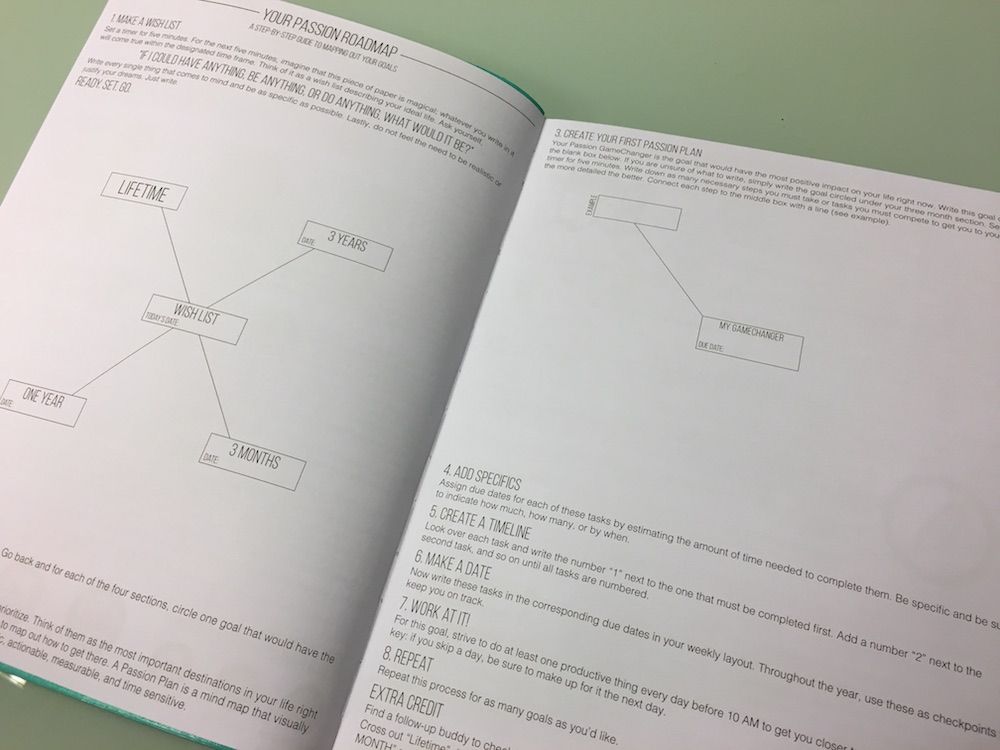 Vervolgens maak je ‘Your Passion Roadmap’. Alle te zetten stappen worden duidelijk omschreven, zodat je lekker aan de slag kunt. Heb je de Engelse taal niet zo goed onder de knie, dan kan dat wel even lastig zijn. Maar goed tijdens het vertalen heb je dan nog meer tijd om na te denken. En dat is goed: voor de Passion Roadmap moet je namelijk echt even gaan zitten. Vervolgens ga je dat uitwerken naar te zetten stappen. Hoe je dat het beste kunt doen: het wordt allemaal uitgelegd. Denk je dat de taal een struikelblok is, dan zou ik persoonlijk voor één van de Nederlandse alternatieven kiezen, zoals de Purpuz Planner of Structuurjunkie-planner. Er zijn er inmiddels zoveel. En je moet wel iets hebben aan de planner. Anders kun je net zo goed een goedkope agenda aanschaffen.