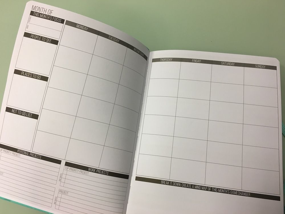 Allereerst is er het maandschema. Hier kun je een overzicht maken van je afspraken die maand. Daarnaast heb je een aantal vaste blokken. Zo geef je zowel je zakelijke als persoonlijke focus voor die maand aan. Noteer je welke mensen je wilt zien. Naar welke plekken je toe wilt. En wat je absoluut NIET wilt doen. Daarnaast heb je ruimte om zowel zakelijke als persoonlijke projecten in stappen onder de verdelen, inclusief deadlines. En er is ruimte om een mind map te maken van de gamechanger van deze maand.