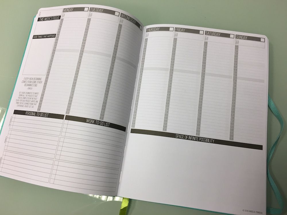 De weekoverzichten liggen echt helemaal in het verlengde van de maandschema’s. Je geeft aan wat de focus voor die week is en benoemd iedere dag ook een focuspunt. Vervolgens kun je afspraken maken tussen 06.00 en 10.30 uur. De tijd is verdeeld in blokken van een half uur, waarbij je één regeltje hebt om je afspraken te benoemen. Hiernaast bevat het weekoverzicht zowel een zakelijke als persoonlijke to do list, waarbij je ze kunt indelen op volgorde van prioriteit. Heb je daar niet genoeg aan of wil je meer beschrijven, dan is er ook nog vrije ruimte.
