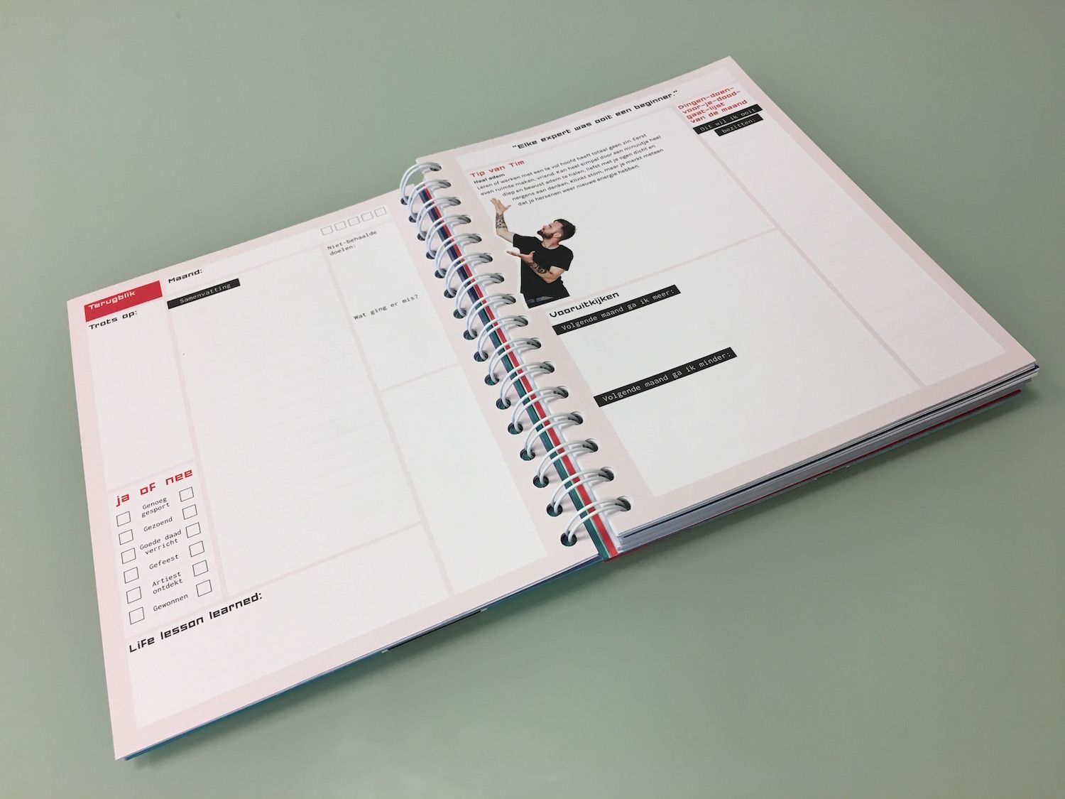 Kijk je per maand, dan heb je een overzichtelijke maand-pagina. Daarnaast kun je aangeven wat je beter wil doen dan vorige maand, wat je belangrijkste todo’s zijn. Wat je wel en niet wil doen. Verder zit er een aparte terugblik pagina in met onderdelen als trots op, life lesson learned, een samenvatting, ja/nee lijstje, niet behaalde doelen en wat ging er mis. Maar ook vooruitkijken: wat ga je meer doen, wat minder. En dingen-doen-voor-jedoodgaat-lijst van de maand. Verder krijg je iedere maand een quote, tip van Tim en tot slot vrije ruimte.